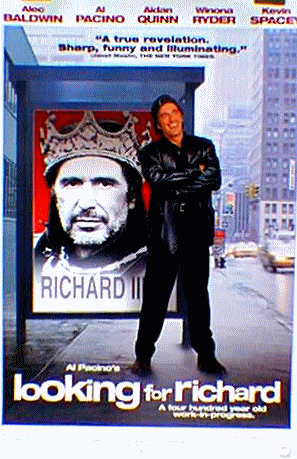 Review of: Looking for Richard. Dir. Al Pacino. Twentieth Century Fox, 1997. by Kim.Fedderson@Lakeheadu.ca and Mike.Richardson@Lakeheadu.ca © 1.Al Pacino's Looking for Richard opens with the words "King Richard" appearing first on the screen with the other syllables necessary for completing the title being added gradually. This device not only highlights the name "Richard III," the protagonist of the Shakespearean source for Pacino's film, it also enlists and then encourages us to search for Richard within the film. And when we go looking for Richard, we can, if we look hard, find him, but not where we had expected and, more tellingly, not where we seem to be directed to look. While it gives us innumerable glimpses of Richard--the documentary frame of the film allows us to see Richard in America, in the Cloisters, in England, at the Globe, in theatrical rehearsal and performance, in cinematic rehearsal and performance--Pacino's film, like Shakespeare's humpbacked dissembler, harbors a "secret, close intent," making Richard far more difficult to locate than his conspicuousness in the film would suggest. And once he is glimpsed, we should begin to question the film's motives. While Pacino claims that his goal is to make Shakespeare more accessible to his public, what he, in fact, does under this typically American anti-elitist and democratic ruse is to appropriate the cultural commodity that Shakespeare has become and then use it to establish American dominance within the global market in which this commodity is distributed. Pacino does this by first undermining the hold that England has had on Shakespeare's work, in effect repossessing the work, and then reforming it to his taste so that it may be marketed at home and ultimately abroad. In this cautionary tale about coming to America, Pacino not only hijacks the bard, but then he also audaciously offers him for sale back to his original owners. Indeed, it is only within the film's conflict with itself, in the division between what it actually does and what it appears to do, that the character of Shakespeare's smiling villain comes clearly into our view. 2.One of the things this film purports to do and in fact does is to provide us with an iteration of Shakespeare's Richard III. That Richard III offers a narrative comprised of four phases: 1) an initial state of sovereignty, presented as "true and just" and represented by King Edward IV, comes to an end as Edward sickens and dies; 2) this is followed by an act of legitimate succession as sovereignty passes into the hands of the legitimate heir, who because of his youth, is assigned a protector; 3) this in turn is disrupted by an act of illegitimate succession as the protector turns usurper, "subtle, false and treacherous," has the rightful heir murdered, and assumes sovereignty himself; 4) finally, the usurper is displaced and dispatched and a new legitimate sovereignty is restored. Pacino's Looking for Richard presents only a selection of scenes from the Shakespearean original, yet these scenes are carefully chosen so as to represent these major narrative phases: hence, the sickness and death of Edward IV (Harris Yulin) is enacted; the young prince inherits his sovereignty but is forced to relinquish it to the Protector (Pacino), who has his charge murdered and so succeeds illegitimately; and finally, the usurper is replaced by the new legitimate monarch, Henry Richmond (Aidan Quinn).
